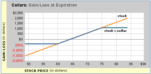 A collar allows an investor to help hedge a long (short) underlying security position by buying (selling) a put with a strike price beneath the current stock price and selling (buying) a call with a strike above it. Both options have the same expiration date. The user accepts a cap on his upside (downside) gains for a floor on his downside (upside) losses.