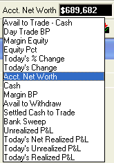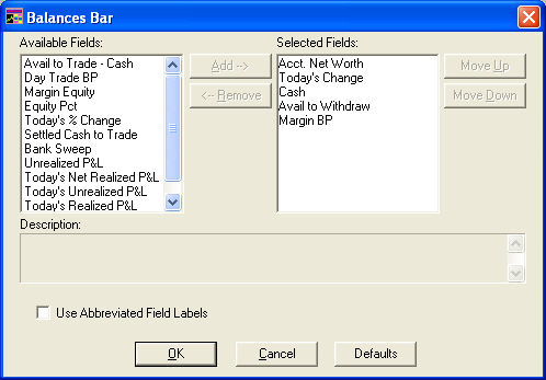 Select the statistics to display by clicking on Toolbars > Customize > Balances Bar in the main menu or by right-clicking on the Balances Bar and selecting Customize... The following settings window opens: