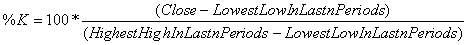 Part of the stochastic indicator along with %D. Shows the price level of a stock in relation to its price range over a given period. You can change the period used in the calculation from the default of 14 periods. The formula for an n-period %K is