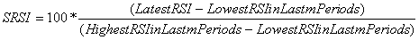 Plots the Stochastic %D line of the RSI (Relative Strength Index) to represent the level of the RSI indicator relative to its range over the number of periods you specify. Default of 14 Stochastic and RSI periods, as well as the default Slowing Factor of 1 can be changed. You can also check the Ten Grid Lines box to display lines from 0.1 to 0.9 instead of two lines at .25 and .75. The formula for an m-period stochastic of an n-period RSI is