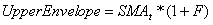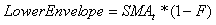 Employing an Envelope is similar to Bollinger Bands®, except equidistant from the center average, in that the Envelope helps define the upper and lower boundaries of a security's normal trading range. When the security reaches the upper band, this may indicate a sell opportunity, whereas the security reaching the lower band may indicate a buy opportunity. Default of 20 periods with Upper and Lower % default of 6 can be changed. The formulas for the upper and lower envelopes are