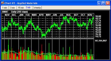This indicator relates volume to price changes by adding volume to a running total when the price closes up for a period, then subtracts the volume if the stock closes down for a period. You can overlay the study on or underneath the price chart.