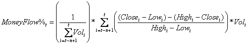 Money Flow Percent normalizes the Money Flow calculation above by dividing by the cumulative volume for the period. You can change the periods used in the calculation from the default of 14.
