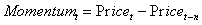 Measures the amount the price of a security has changed over the last 14 days. If the current trading session today hasn't closed yet, it uses the last sale price. You can change the periods used in the calculation from the default of 14. The formula for an n-period Momentum is |