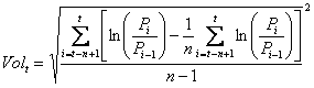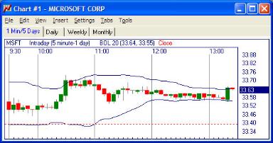 The top and bottom lines are placed n-standard deviations above and below the center line*. Since standard deviations are a measure of volatility, the bands widen during volatile price action and contract when the trading range tightens. You can change the variables used in the calculation from the defaults of period=20 and n=2 standard deviations above and below. *The center line is not included when applying a Bollinger Bands study. To get a center line, add a Moving Average - Simple study for the same number of periods (default=20) to the chart. Rather than two bands that are always an equal percentage away from the central average, Bollinger Bands expand and contract based on the standard deviation of the historical volatility of the price action. The formulas for the upper and lower bands are