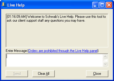 NOTE:  It is important that you do not use the Live Help window in the Schwab® trading platforms to request, authorize or effect the purchase or sale of any security or commodity, to send fund transfer instructions, or to effect any other transactions.  Any such requests, orders, or instructions that you send will not be accepted and will not be processed.