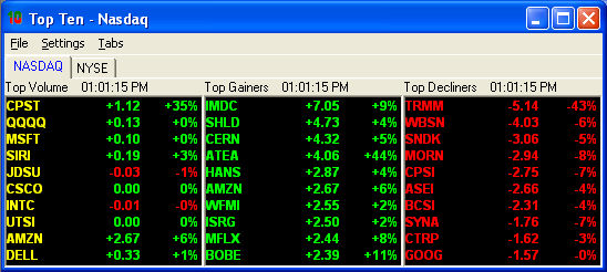 Traders can react to active securities by quickly consulting the Top Ten window. View Top Volume, Top Gainers, and/or Top Decliners for NASDAQ® and/or NYSE Data. Also available for the options markets.